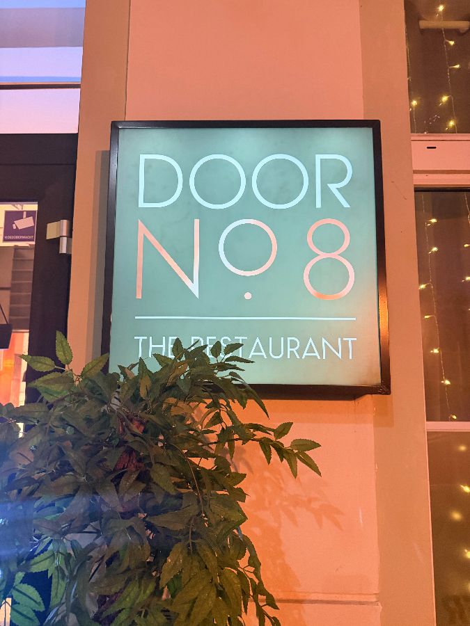 푸른 조명이 은은하게 비추는 ‘DOOR NO. 8 THE RESTAURANT’ 간판은 밤이 되면 더욱 운치 있는 분위기를 자아냅니다.
