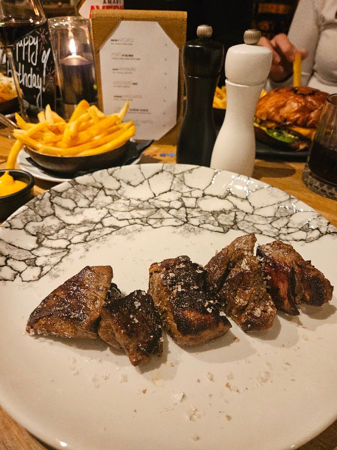 먹기 좋게 잘라진 스테이크 조각들은 적절한 시즈닝과 함께 완벽하게 조리되어 있습니다. 사이드 메뉴로 제공되는 바삭한 감자튀김도 스테이크와의 조화가 훌륭합니다.
