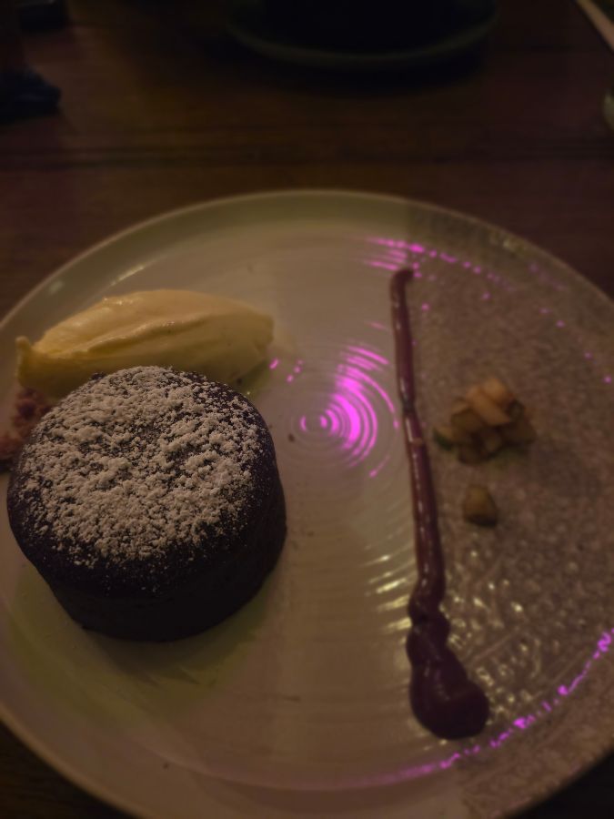 따뜻한 초콜릿 폰당에 슈가 파우더가 소복이 뿌려져 있고, 옆에는 부드러운 바닐라 아이스크림과 달콤한 소스가 곁들여져 있습니다.