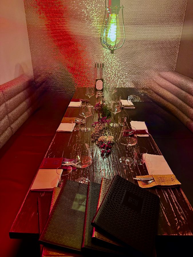 정갈하게 차려진 테이블 위에는 고급스러운 와인잔과 식기가 놓여 있고, 뒤편으로는 아늑한 조명이 드리워져 있습니다.
