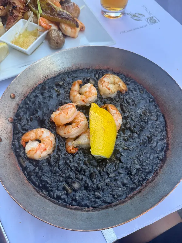 탱글탱글한 새우가 돋보이는 먹물 리조또, 눈과 입이 즐거운 경험.