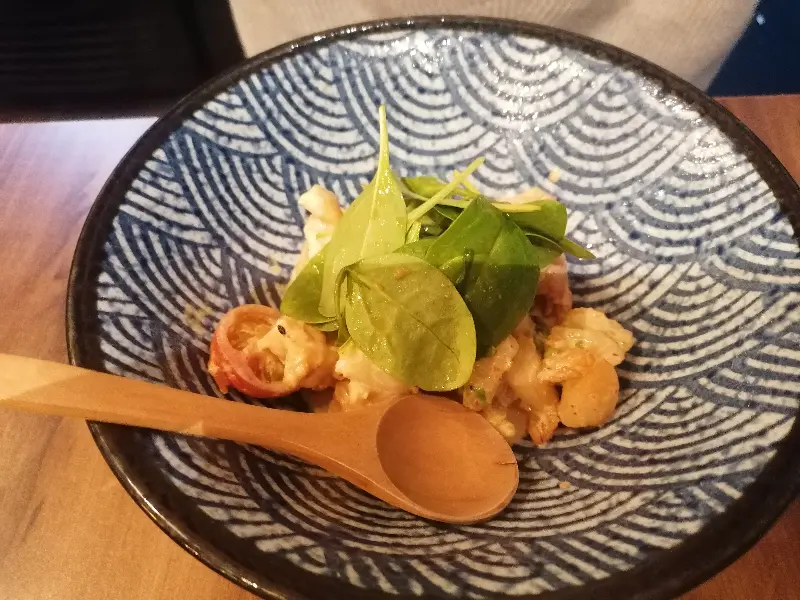 기다림 끝에 드디어 첫 번째 요리가 나왔다. 아름다운 물결무늬가 새겨진 푸른 접시에 담긴 샐러드는 신선한 채소와 해산물이 조화롭게 어우러져 있었다. 특히, 곁들여진 나무 스푼은 음식을 더욱 특별하게 느껴지게 했다. 입안 가득 퍼지는 신선한 풍미는 미각을 깨우는 듯했다.