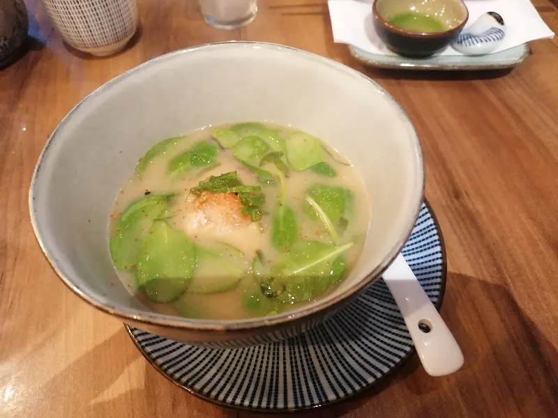 이어서 나온 따뜻한 국물 요리는 부드러운 두부와 신선한 채소가 어우러져 깊은 풍미를 자랑했다. 특히, 국물 위에 떠 있는 초록색 잎채소는 시각적인 아름다움을 더했다. 차가운 음식으로 살짝 긴장했던 몸이 따뜻하게 녹아내리는 듯했다.