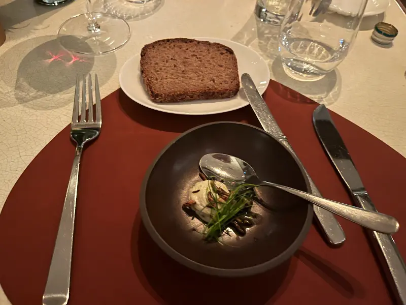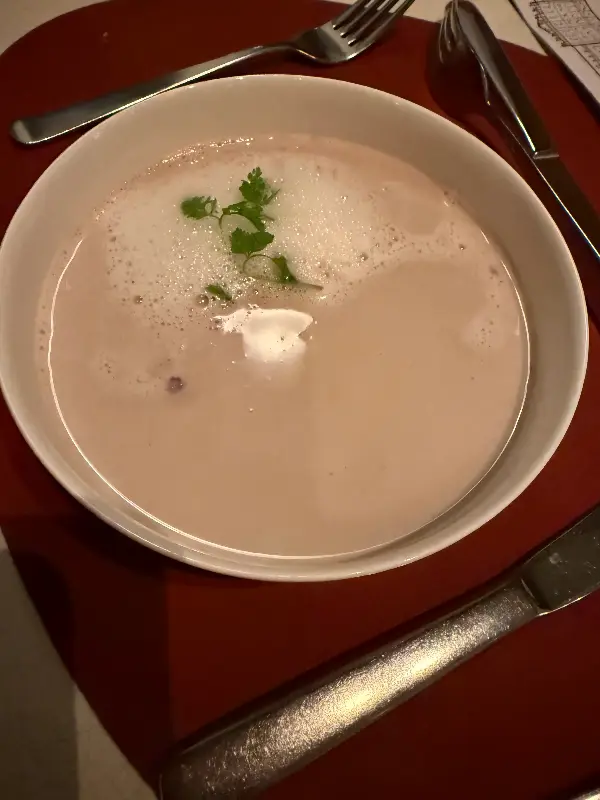 메뉴를 펼쳐 들자 다채로운 요리들이 눈길을 사로잡습니다. 그중에서도 Chestnut Soup & Schnitzel은 꼭 맛봐야 할 메뉴입니다. 밤 수프는 훈제 오리 가슴살, 트러플 폼, 크랜베리와 함께 제공되어 풍성한 계절의 맛을 선사합니다. 입안 가득 퍼지는 밤의 풍미와 트러플의 향긋함, 그리고 크랜베리의 상큼함이 완벽한 조화를 이룹니다.