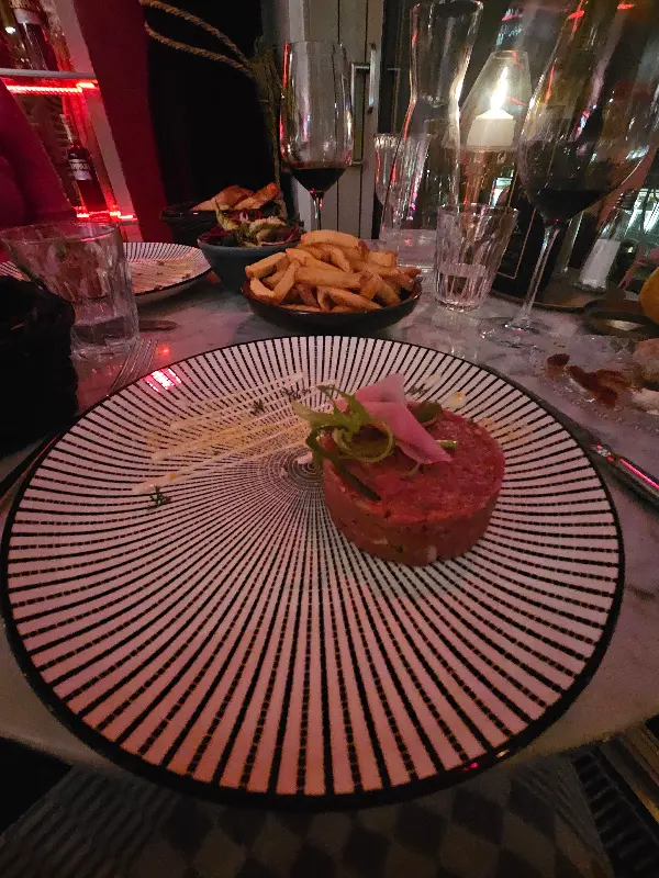 테이블 위에는 정갈하게 세팅된 식기와 함께 메뉴판이 놓여 있었습니다. 메뉴판을 펼쳐보니 다양한 프랑스 요리들이 눈길을 사로잡았습니다. 웨이터 분의 친절한 설명과 추천을 받아 스테이크 타르타르와 칼라마리 리조또를 주문했습니다. 잠시 후, 식전 빵과 함께 작은 에피타이저가 나왔습니다. 터키인인 것을 알고 특별히 준비해주신 서비스라니, 예상치 못한 따뜻한 배려에 감동했습니다.