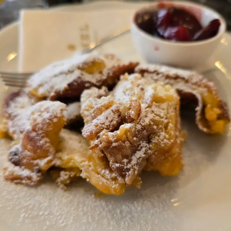 먼저 카이저슈마렌을 맛보았습니다. 겉은 살짝 바삭하고 속은 폭신한 식감이 정말 좋았습니다. 버터향이 은은하게 퍼지면서 달콤한 슈가파우더와 어우러져 환상적인 맛을 선사했습니다. 특히 함께 제공된 자두잼을 곁들여 먹으니 새콤달콤함이 더해져 더욱 맛있었습니다. 카이저슈마렌은 생각보다 많이 달지 않아서 계속 손이 가는 맛이었습니다.
