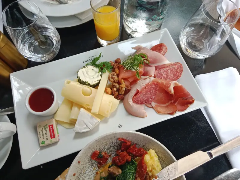 “게스트하우스”에서는 빵 외에도 다양한 아침 식사 메뉴를 즐길 수 있다. 치즈 플래터는 신선한 치즈와 견과류, 과일이 풍성하게 담겨 있어, 와인과 함께 즐기기에도 좋다. 특히 직접 만들었다는 빵 종류가 매우 다양하게 나오는데, 조금씩 비교해서 먹는 것도 특별한 경험이다.