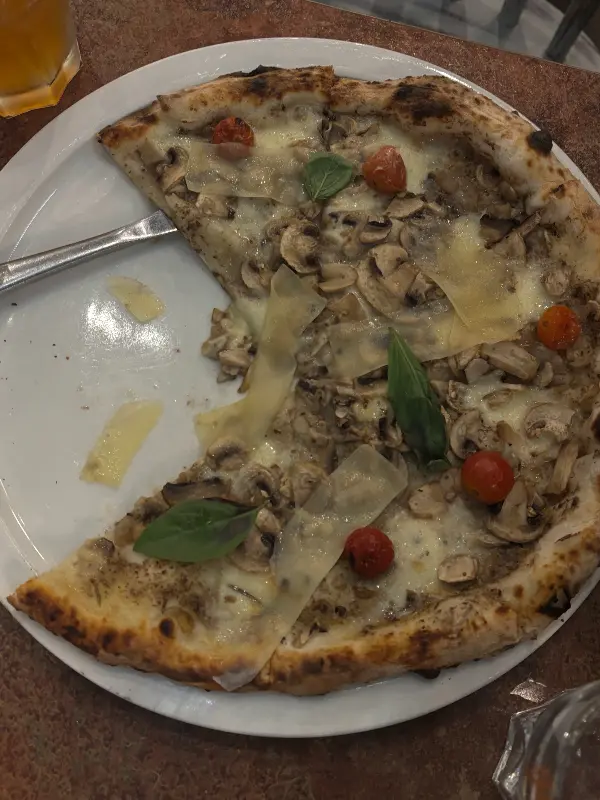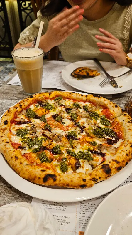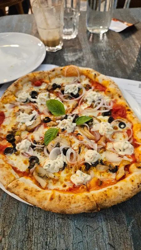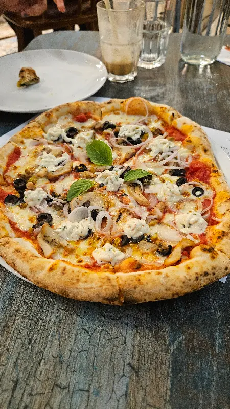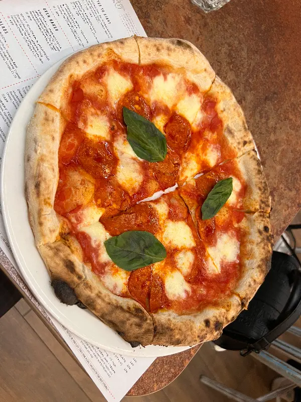 드디어 기다리고 기다리던 피자가 나왔다. 겉은 바삭하고 속은 쫄깃한 사워도우 크러스트는 보기만 해도 군침이 돌았다. 추천받은 피자를 한 입 베어 무니, 입안 가득 퍼지는 사워도우 특유의 새콤달콤한 풍미가 일품이었다. 토핑으로 올라간 신선한 재료들과 사워도우의 조화는 환상적이었다. 쫄깃하고 부드러운 크러스트는 씹을수록 고소했고, 바질을 좀 더 넣었으면 좋았겠다는 아쉬움이 남았지만 전체적으로 만족스러웠다.