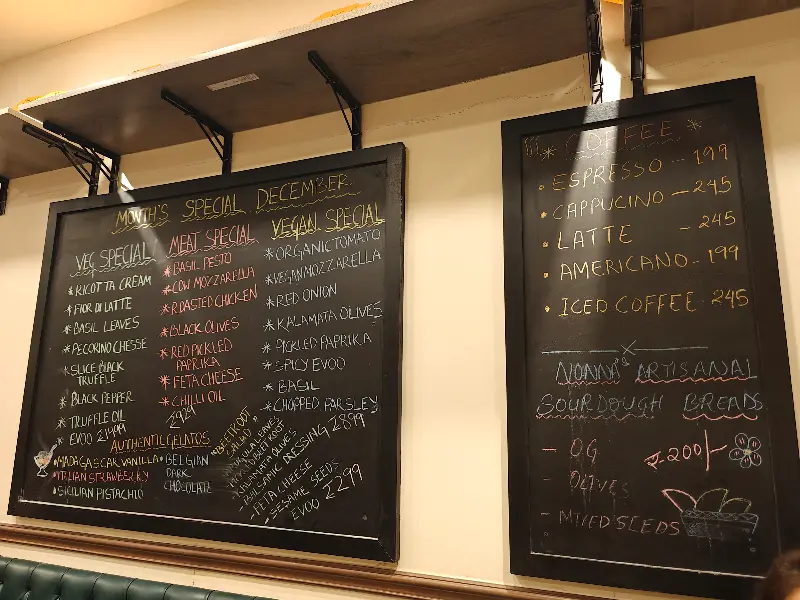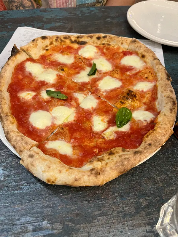 벽에 걸린 검은 보드에는 다양한 메뉴가 적혀 있었다. 메뉴판을 살펴보니 피자 외에도 깔조네, 샐러드, 디저트 등 다양한 이탈리아 음식을 맛볼 수 있다는 사실을 알게 되었다. 파스타는 없었지만, 피자에 집중한 메뉴 구성이 오히려 전문성을 느끼게 했다. 샐러드 중에서는 eggplant palmigiana와 casareccia 샐러드가 눈에 띄었다. 루꼴라, 블랙올리브, 파마산 치즈, 토마토의 조합은 보기만 해도 신선함이 느껴졌다.