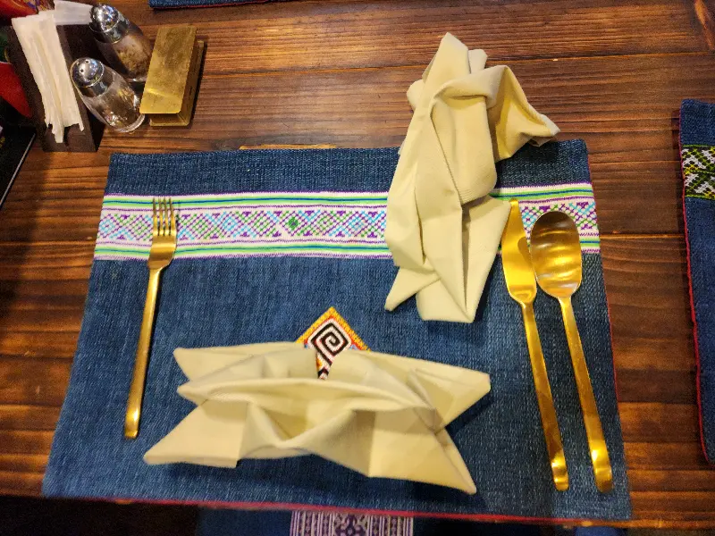 문을 열고 들어서자, 은은한 조명이 아늑한 분위기를 더했다. 테이블 위에는 정갈하게 세팅된 식기들이 놓여 있었다. 파란색 바탕에 전통적인 무늬가 수놓아진 테이블 매트와 금색 커트러리가 고급스러움을 더했다. 마치 작은 예술 작품을 감상하는 듯한 기분이었다. 종이냅킨을 정성스럽게 접어 놓은 모습에서 세심한 배려가 느껴졌다.