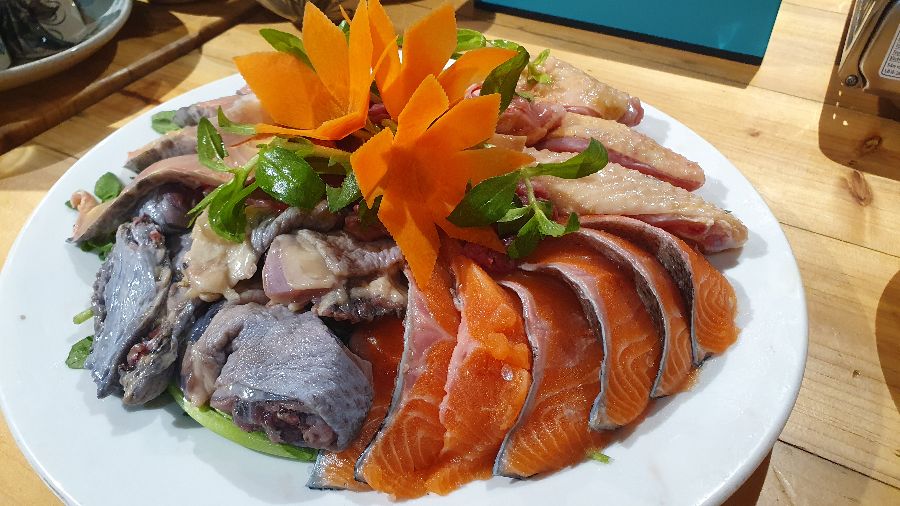 저희는 여러 리뷰에서 극찬하던 믹스 핫팟(Mixed Hot Pot)을 주문했습니다. 철갑상어, 연어, 닭고기, 오골계, 소고기 등 여러 종류의 신선한 재료들이 푸짐하게 담겨 나왔습니다. 접시에 정갈하게 담겨 나온 다채로운 빛깔의 재료들은 신선함을 시각적으로도 전달해주었죠. 붉은빛 소고기, 주황빛 연어, 독특한 색감의 오골계와 철갑상어까지, 가지런히 놓인 재료들의 향연은 핫팟에 대한 기대를 한껏 끌어올렸습니다.