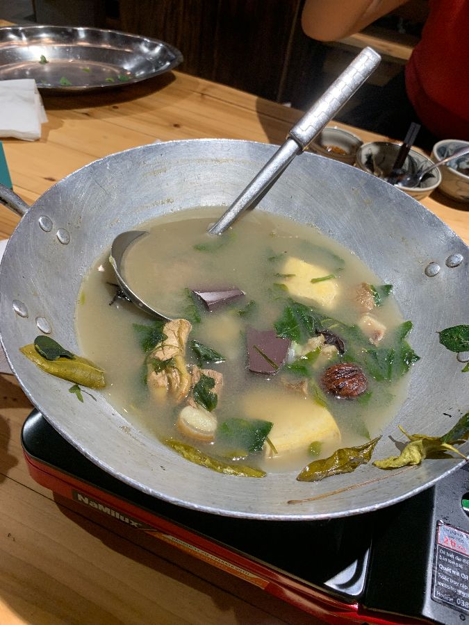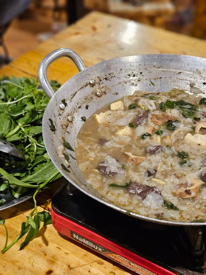 이곳에서 제공되는 다양한 식재료들은 사파 지역의 풍요로움을 그대로 보여주는 듯했습니다. 특히 현지인들이 즐겨 찾는 로컬 식당인 만큼, 베트남 북부 산악지대의 특색 있는 식재료들을 경험할 수 있다는 점이 큰 매력이었습니다. 핫팟에 넣을 고기 외에도, 이미 끓여져 나온 듯한 죽 형태의 요리도 있었는데, 이는 또 다른 형태의 핫팟이나 현지식을 경험하고 싶은 이들에게 좋은 선택이 될 것입니다.