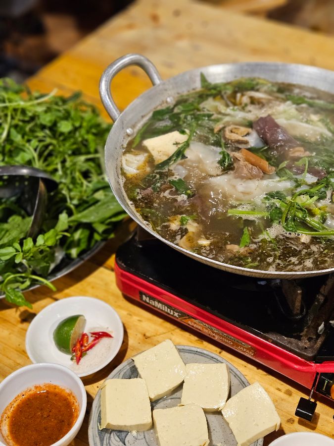 Thắng Cố A Dũng의 핫팟은 사파의 명물답게 다양한 선택지를 제공했습니다. 이곳의 핫팟은 마치 한국의 샤브샤브나 훠궈와 비슷한 형태였는데, 깊고 진한 국물 맛이 한국인의 입맛에 매우 친숙한 것이 특징입니다. 특히 한방 삼계탕을 연상시키는 육수는 판시판 트레킹이나 소수민족 마을 탐방 후 지친 몸을 따뜻하게 녹여주기에 그만이었습니다. 몸속 깊은 곳까지 온기가 퍼지며 노곤함이 스르르 풀리는 느낌은 마치 찜질방에서 개운하게 땀을 뺀 듯한 기분마저 들게 했습니다.