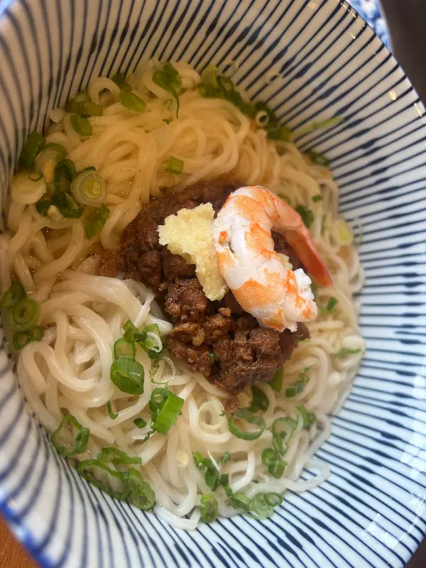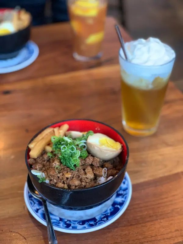 가장 먼저 맛본 것은 다진 돼지고기 덮밥. 짙은 갈색 빛깔의 돼지고기가 밥 위에 듬뿍 올려져 있었고, 그 위에는 싱그러운 초록색 파가 보기 좋게 흩뿌려져 있었다. 젓가락으로 살짝 비벼 한 입 맛보니, 입 안 가득 퍼지는 고소함에 절로 감탄사가 나왔다. 돼지고기는 잡내 하나 없이 부드러웠고, 짭짤하면서도 달콤한 양념은 밥과 환상적인 조화를 이루었다. 특히, 덮밥과 함께 나온 따뜻한 국물은 입안을 깔끔하게 마무리해주는 역할을 톡톡히 했다.