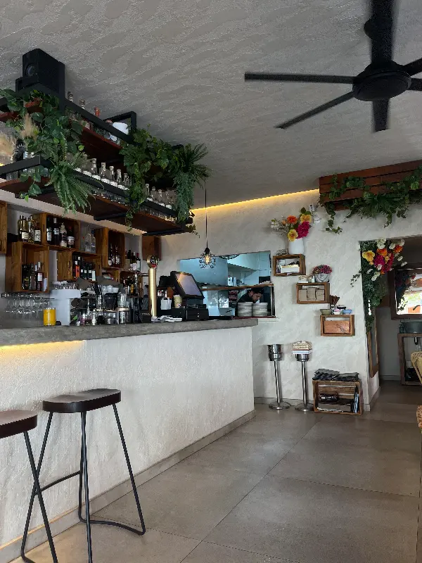 깔끔하게 정돈된 바 테이블과 싱그러운 식물 장식이 조화로운 공간입니다.