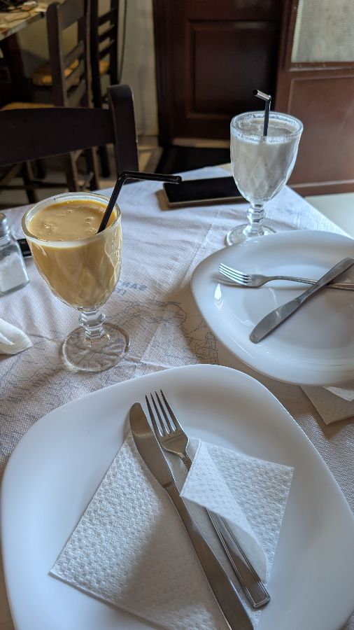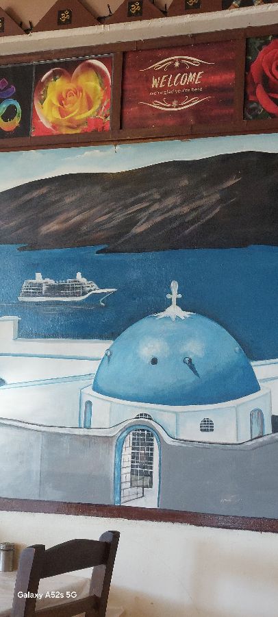 자이푸르 팰리스의 실내는 인도적인 요소들로 아늑하게 꾸며져 있습니다. 벽면에 그려진 산토리니의 푸른 돔 지붕과 바다, 그리고 그 위를 유유히 떠다니는 유람선 그림은 이곳이 그리스에 위치한 인도 음식점임을 상기시켜줍니다. (Image 3) 하지만 동시에 실내 곳곳에 배치된 인도 전통 인형들은 이 공간이 인도 문화의 정취를 담고 있음을 명확히 보여줍니다. (Image 5, Image 8, Image 9)