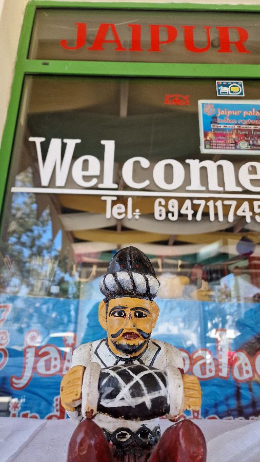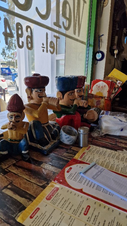 입구에 놓인 ‘Welcome’ 표지와 함께 드럼을 치는 듯한 형상의 인도 전통 인형은 방문객을 반갑게 맞이합니다. (Image 5, Image 8) 유리창 너머로 보이는 거리 풍경과 어우러져 이국적인 동시에 친근한 분위기를 자아냅니다. 실내 테이블 위에 놓인 다양한 자세의 인도 인형들은 마치 작은 공연을 펼치는 듯한 착각을 불러일으키며, 식사 중 소소한 즐거움을 선사합니다. (Image 9)