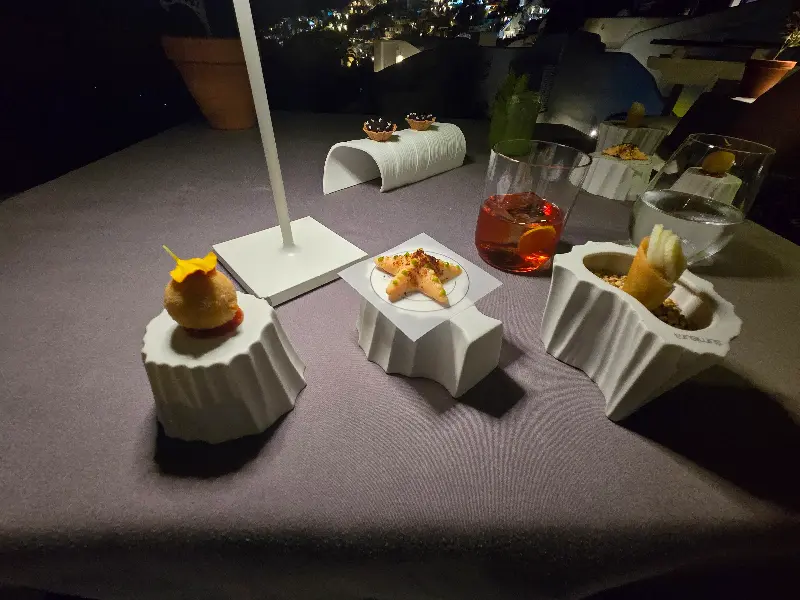 저녁 식사 전, 칵테일 한 잔을 즐기며 여유로운 시간을 보냈습니다. 은은한 조명 아래, 잔잔한 음악이 흐르는 공간. 창밖으로는 칼데라의 아름다운 풍경이 펼쳐집니다. 마치 시간이 멈춘 듯한 평화로운 분위기 속에서, 저는 곧 다가올 미식 경험에 대한 기대감을 키워나갔습니다.