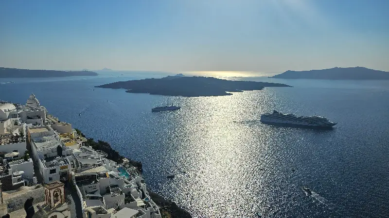 테라스에 들어서자 눈 앞에 펼쳐진 것은 그림 같은 풍경이었습니다. 푸른 바다와 하얀 집들이 조화롭게 어우러진 칼데라 뷰는 그야말로 장관이었습니다. 마치 엽서 속 한 장면을 그대로 옮겨 놓은 듯했습니다. 해가 지기 전이라 햇살이 다소 뜨거웠지만, 시원한 바람이 불어와 더위를 식혀주었습니다.