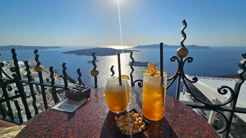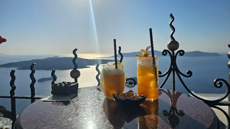 푸른 바다를 배경으로 즐기는 칵테일 한 잔, 산토리니의 낭만을 더해줍니다.