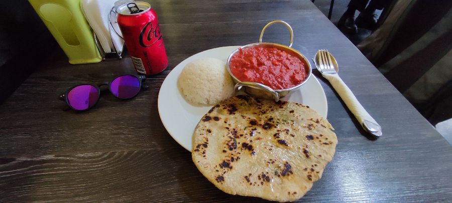 깔끔한 한상차림: 카레, 밥, 난, 그리고 탄산음료와 선글라스가 놓여 있습니다.