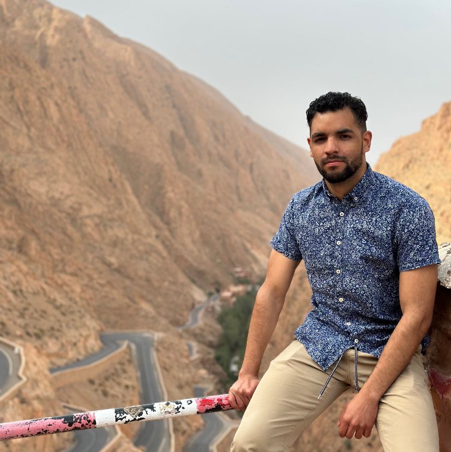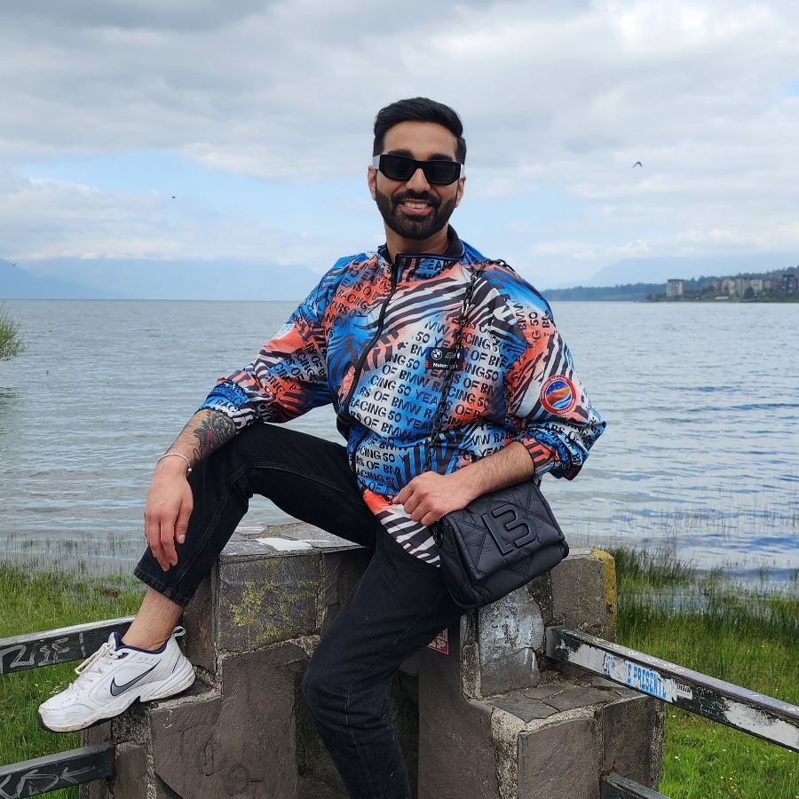 멋진 풍경 속 남자의 모습은 맛있는 식사 후의 만족감과 여행의 즐거움을 표현하는 듯합니다.