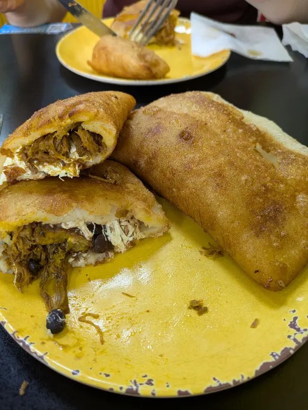 아레파와 함께 엠파나다와 페이스트리도 맛보았습니다. 엠파나다는 닭고기와 소고기 두 종류가 있었는데, 둘 다 속 재료가 푸짐하게 들어있어 든든했습니다. 겉은 바삭하고 속은 촉촉한 엠파나다는 마치 따뜻한 엄마의 손길이 느껴지는 맛이었습니다. 특히 함께 제공된 소스는 엠파나다의 풍미를 한층 더 끌어올려 줬습니다.