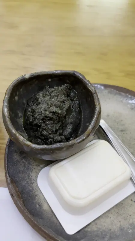 식전빵과 함께 제공되는 버터와 검은색 스프레드는 독특한 풍미를 선사합니다. 특히 검은색 스프레드는 처음 맛보는 신선한 경험이었습니다.