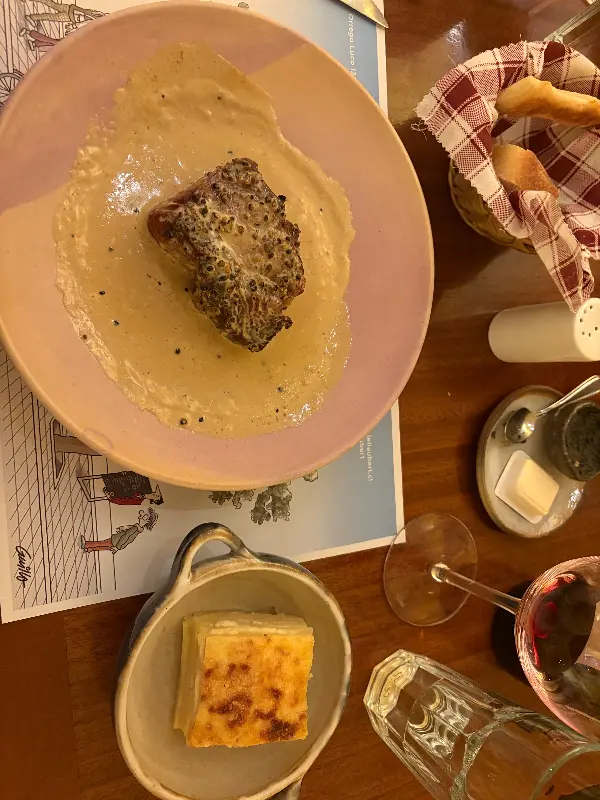 함께 방문한 친구는 등심 스테이크를 주문했는데, 한 입 맛보더니 인생 최고의 스테이크라고 극찬했습니다. 육즙이 풍부하고 부드러운 식감이 일품이었고, 칠레 와인과의 조화 또한 환상적이었다고 합니다. “품질 대비 가격도 훌륭해서 산티아고에 가면 꼭 가봐야 할 곳”이라고 칭찬을 아끼지 않았죠. 숙성된 고기를 선호하지 않는 사람도 이곳의 파테는 맛있게 즐길 수 있다고 하니, 다음 방문 때는 꼭 파테를 맛봐야겠습니다.