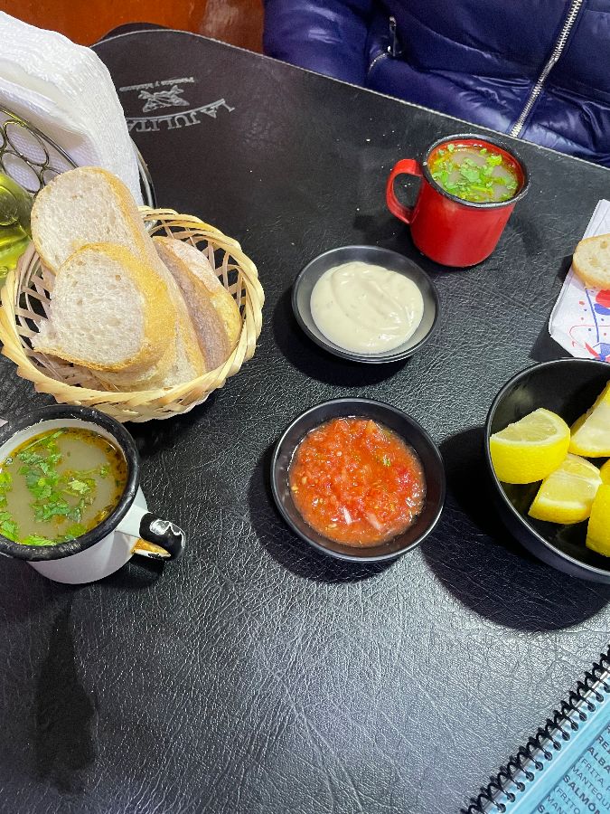 테이블에는 식전 빵과 함께 다양한 소스, 그리고 싱싱한 레몬 조각이 정갈하게 놓여 있습니다. 이 작은 디테일들이 손님을 환영하는 라 훌리타만의 방식입니다. 특히, 손에 알코올 소독제를 제공하는 위생적인 부분은 많은 이들이 극찬하는 요소 중 하나입니다. 붐비는 시장 안에서 쾌적하고 청결한 환경을 유지하려는 노력이 돋보이며, 덕분에 손님들은 안심하고 식사에 집중할 수 있습니다.