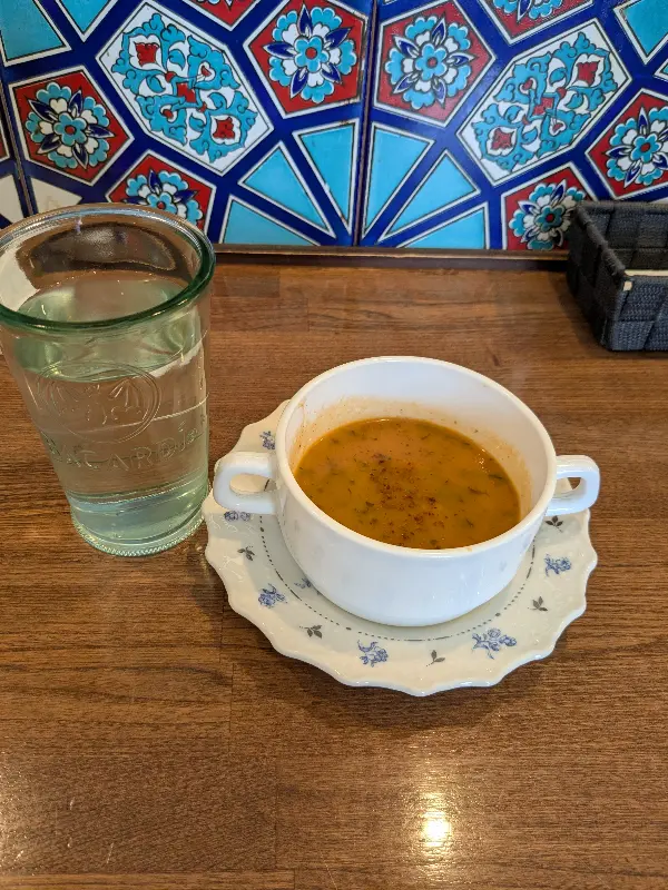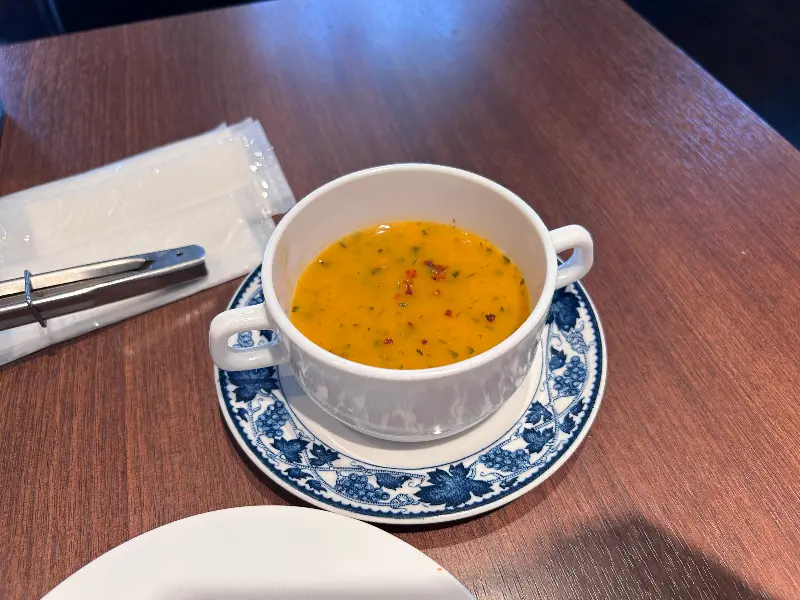 음식을 기다리는 동안, 먼저 따뜻한 수프가 나왔습니다. 옅은 주황빛을 띄는 수프는 향신료 향이 은은하게 퍼져나왔습니다. 한 입 맛보니, 익숙하면서도 새로운 맛이었습니다. 향신료와 허브의 조화가 훌륭했고, 입안 가득 퍼지는 풍미가 식욕을 돋우었습니다. 파란색 패턴이 그려진 컵 받침이 수프의 색감과 어우러져 더욱 먹음직스러워 보였습니다.