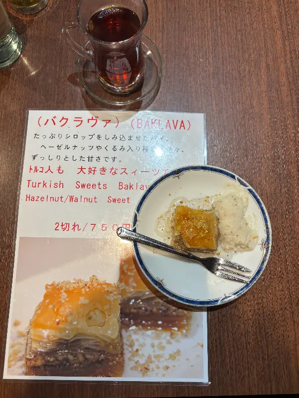 식사를 마치고 디저트로 바클라바를 주문했습니다. 얇은 페이스트리 겹겹이 견과류가 들어있고, 달콤한 시럽이 듬뿍 뿌려져 있었습니다. 바클라바를 한 입 베어 무니, 달콤함이 입안 가득 퍼져 나갔습니다. 견과류의 고소함과 시럽의 달콤함이 환상적인 조화를 이루었습니다. 따뜻한 터키식 차와 함께 먹으니, 달콤함이 더욱 깊게 느껴졌습니다.