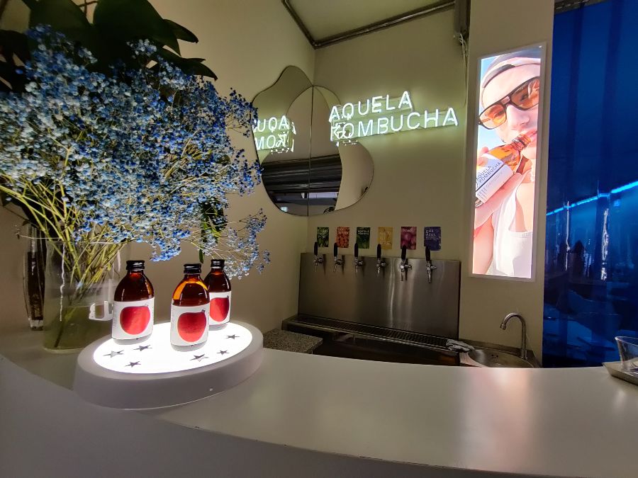 매장 입구에는 아켈라 콤부차 병들로 장식된 독특한 오브제가 시선을 사로잡는다. 콤부차 병을 활용한 아이디어가 신선하게 다가왔다.