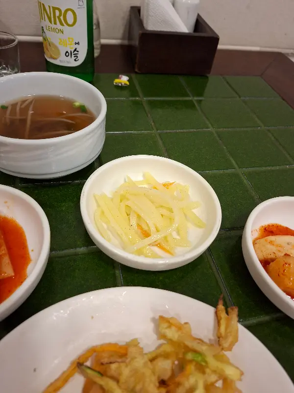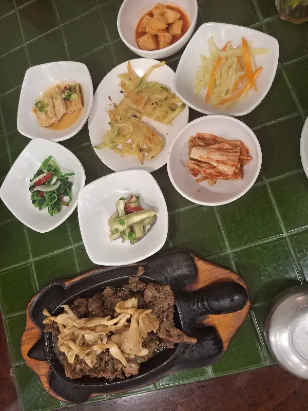 석정에 들어서자마자 눈에 띄는 것은 정갈하게 놓인 밑반찬들입니다. 김치, 콩나물무침, 깻잎 장아찌 등 보기만 해도 입맛을 돋우는 반찬들은 하나하나 정성이 느껴집니다. 특히 직접 담근 김치의 깊은 맛은 한국에서 먹던 바로 그 맛입니다. 밑반찬 하나하나에서 느껴지는 따뜻함은, 마치 어머니가 차려주신 밥상 앞에서 느끼는 푸근함과 같습니다.