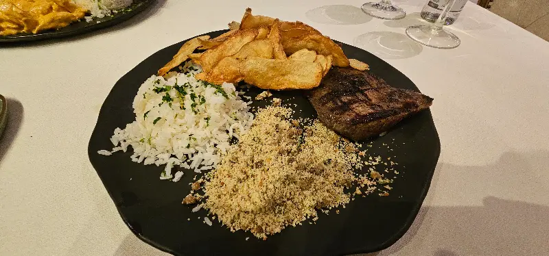 잘 구워진 스테이크와 함께 곁들여 나오는 밥, 파로파, 감자칩. 특히 앵거스, 프리미엄 앵거스 등 최상급 부위의 고기는 풍부한 육즙과 부드러운 식감을 자랑합니다.