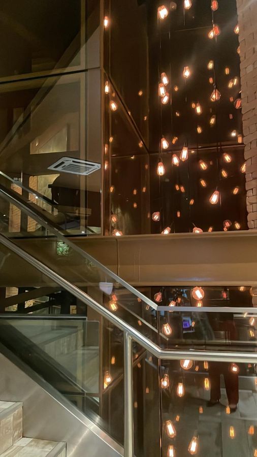 코코 밤부에 들어서자마자 가장 먼저 눈에 띄는 것은 고급스러우면서도 편안한 분위기입니다. 은은한 조명이 테이블 위를 비추고, 벽돌 벽과 조화를 이루는 현대적인 인테리어는 따뜻함과 세련됨을 동시에 선사합니다. 한쪽 벽면을 가득 채운 와인 컬렉션은 미식에 대한 기대감을 높이며, 곳곳에 놓인 식물들은 공간에 생기를 불어넣습니다. 특히 인상적인 것은 계단 옆 벽면에 설치된 조명 장식입니다. 수많은 전구가 마치 반딧불처럼 빛나며 몽환적인 분위기를 자아냅니다.