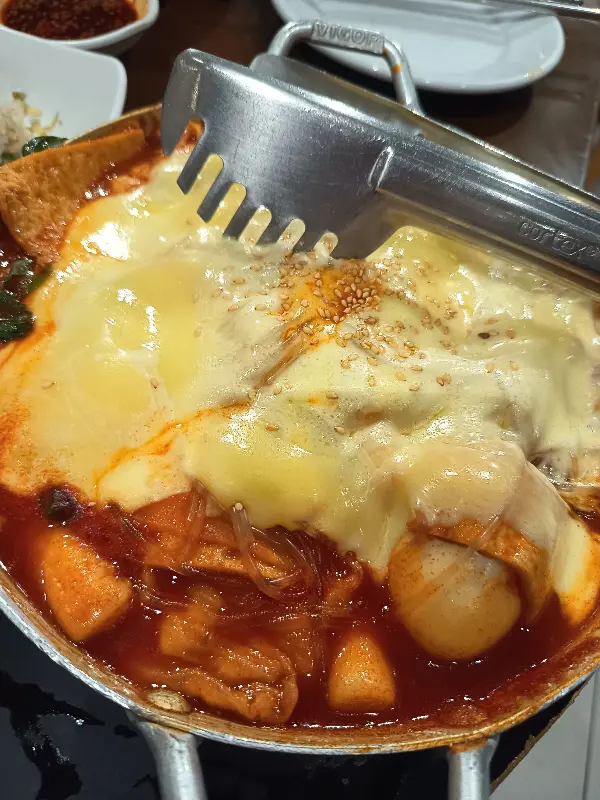 친구와 함께 나눠 먹은 치즈 떡볶이도 빼놓을 수 없습니다. 매콤한 떡볶이 위에 듬뿍 올려진 치즈는 환상적인 비주얼을 자랑했습니다. 쫄깃한 떡과 매콤달콤한 양념, 그리고 고소한 치즈의 조합은 그야말로 최고였습니다. 떡볶이를 먹는 동안, 땀이 송골송골 맺혔지만 멈출 수 없는 맛이었습니다.