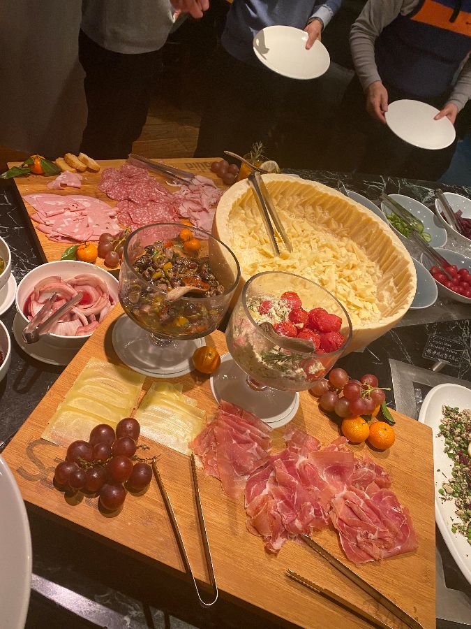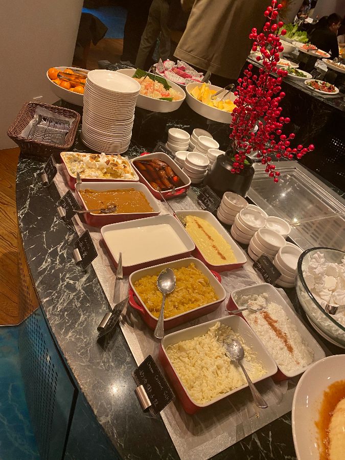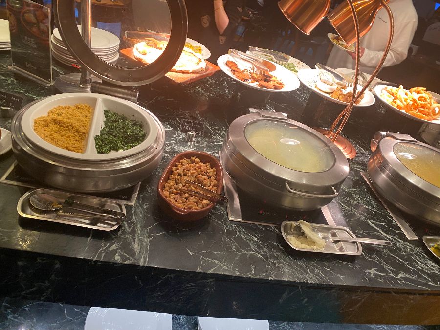 뷔페 테이블에는 신선한 샐러드와 다양한 곁들임 음식들도 풍성하게 준비되어 있었습니다. 고기를 먹는 중간중간 입 안을 상큼하게 해 주는 샐러드는, 무한대로 고기를 즐길 수 있도록 도와주는 숨은 공신이었습니다. 나무로 된 도마 위에 정갈하게 놓인 치즈와 햄, 싱싱한 과일들은 보는 즐거움까지 더했습니다.