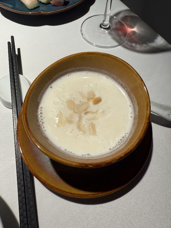 따뜻한 베이지색 그릇에 담긴 아몬드차로 추정되는 음료입니다. 하얀색 액체 위에 얇게 썰린 아몬드가 고명으로 얹어져 있어 고소한 맛과 부드러운 질감을 동시에 느낄 수 있습니다.