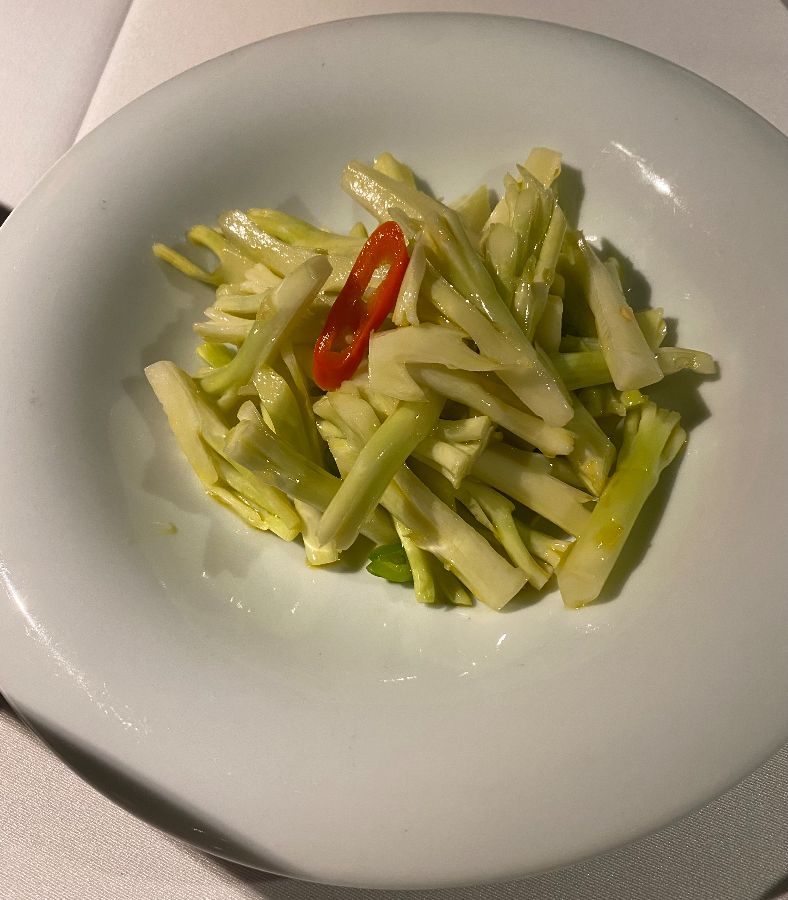 하얀 접시에 담긴 신선한 채소 요리로, 아삭하고 시원해 보이는 연두색 채소가 먹음직스럽게 놓여 있습니다. 붉은 고추 조각이 시각적인 포인트를 주어 식욕을 자극합니다. 메인 요리와 함께 즐기기 좋은 상큼한 사이드 메뉴입니다.