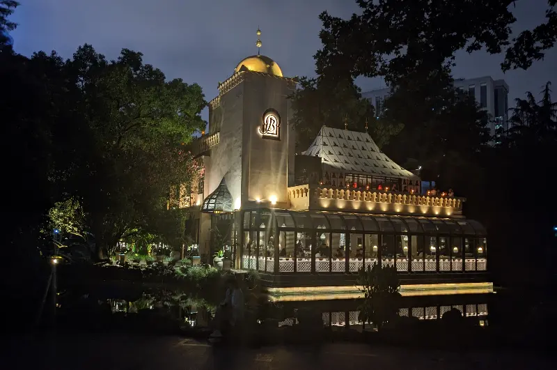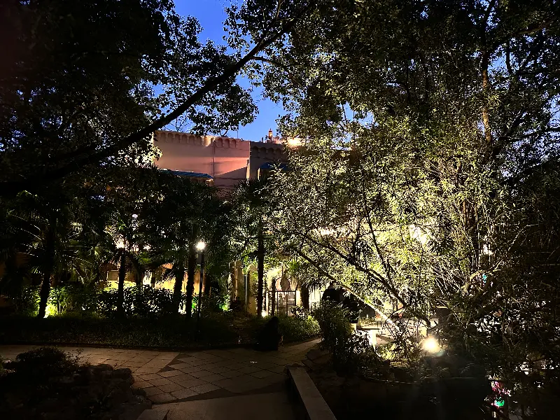 택시에서 내려 레스토랑을 올려다보니 마치 동화 속에 나오는 성처럼 아름다운 외관이 눈에 들어왔다. 어둠 속에서 은은하게 빛나는 조명은 신비로운 분위기를 자아냈고, 주변의 푸른 나무들과 어우러져 더욱 매혹적인 풍경을 만들어냈다. 마치 숨겨진 보물을 찾아가는 듯한 설렘이 느껴졌다.