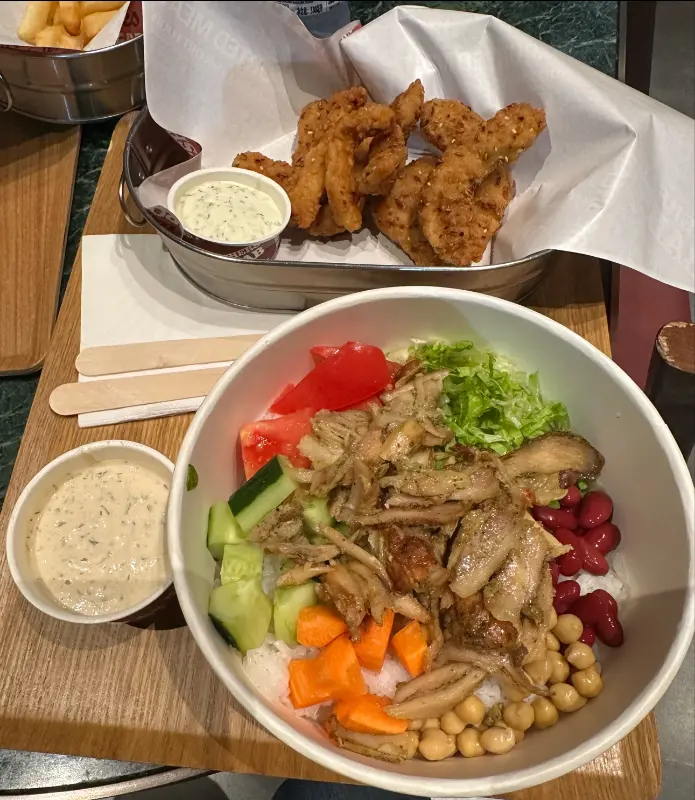 갓 튀겨져 나온 따끈한 감자튀김과 신선한 샐러드가 푸짐하게 담겨 있습니다. 케밥과 함께 곁들여 먹으면 더욱 든든한 한 끼 식사를 즐길 수 있습니다.