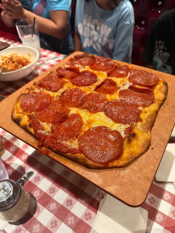 실제로 테이블 위에 놓인 피자를 보면, 네모난 모양에 촘촘히 박힌 페퍼로니가 시선을 사로잡습니다. 윤기가 자르르 흐르는 페퍼로니는 짭짤하면서도 고소한 풍미를 자랑하며, 부드러운 치즈와 환상적인 조화를 이룹니다.