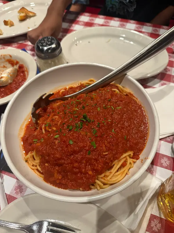 테이블 위에 놓인 커다란 스파게티 그릇을 보면, 붉은 토마토 소스가 면을 빈틈없이 감싸고 있는 모습이 인상적입니다. 파슬리 가루가 살짝 뿌려져 있어 색감을 더하고, 스파게티를 뜨는 서버의 손길은 능숙하고 여유롭습니다.
