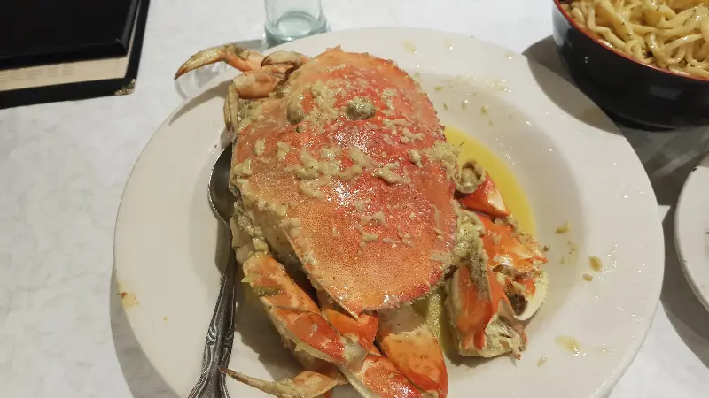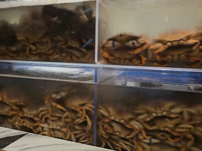 레스토랑 입구에는 커다란 수조가 있었는데, 그 안에는 싱싱한 던저니스 크랩들이 가득했습니다. 마치 살아있는 해산물 시장에 온 듯한 기분이었습니다. 투명한 물속에서 활발하게 움직이는 크랩들을 보니 신선함이 그대로 느껴졌습니다. 오늘 저녁 만찬의 주인공을 직접 눈으로 확인하는 순간, 기대감은 더욱 커져갔습니다.