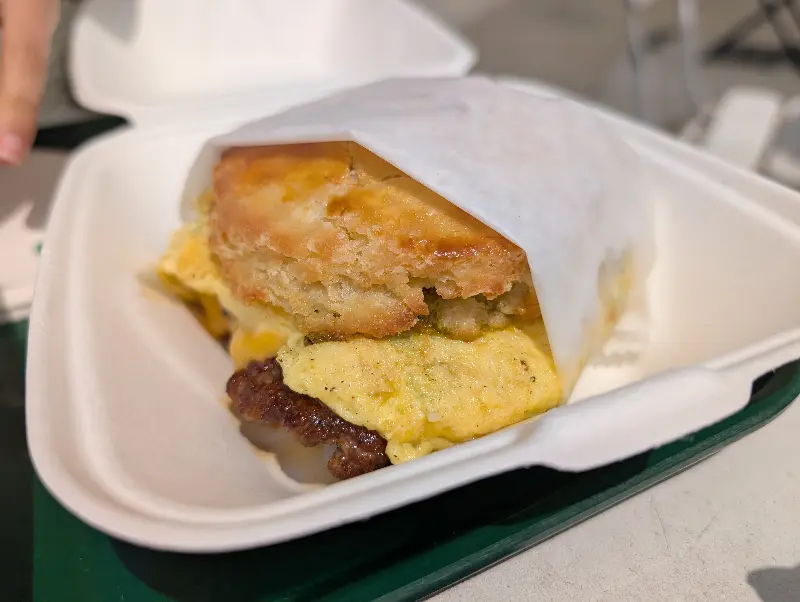 특히 부드러운 스크램블 에그와 짭짤한 소시지의 조합은 환상적이었다. 비스킷의 고소함과 어우러져 완벽한 아침 식사를 완성하는 느낌이었다. 샌드위치를 감싸고 있는 종이 포장지에는 기름기가 살짝 배어 나왔지만, 그마저도 맛있어 보이는 건 왜일까.