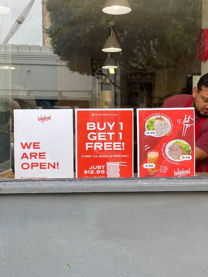 다음 날, 홀리슈레드 누들의 또 다른 인기 메뉴인 크리스피 치킨 라이스를 맛보기 위해 다시 방문했다. 이번에는 “BUY 1 GET 1 FREE!”라는 문구가 적힌 광고판이 눈에 띄었다. 오픈 초기에 진행했던 이벤트인 듯하다.