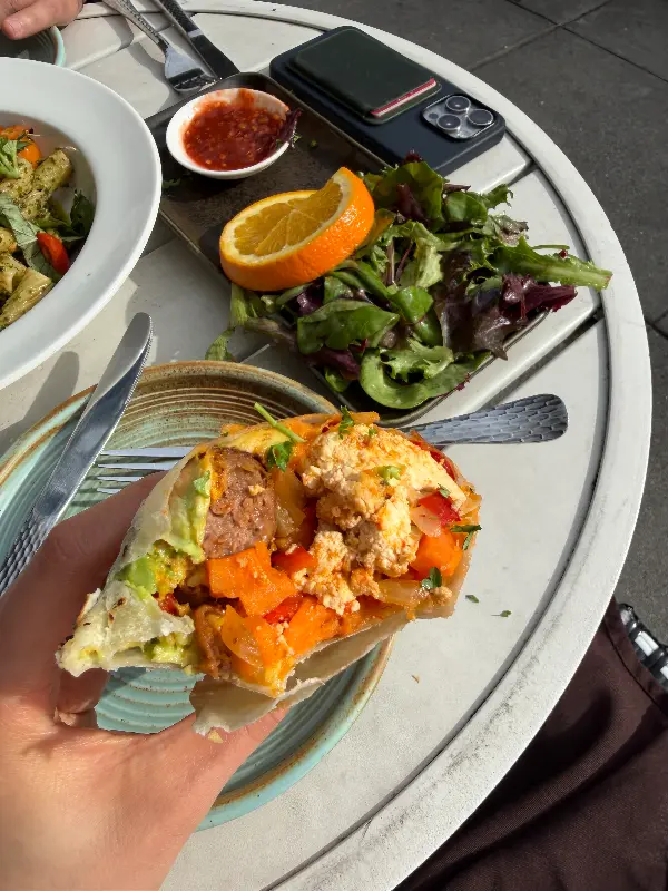 aiso의 브런치 부리토는 신선한 야채와 두부가 가득 차 있어 건강하고 든든한 한 끼 식사로 완벽합니다.
