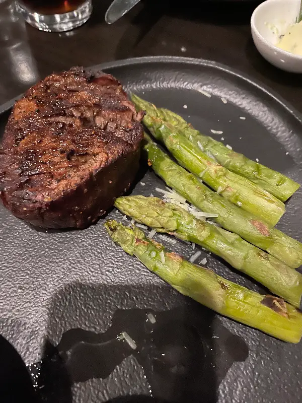 스테이크 한 점을 입에 넣는 순간, 육즙이 입안 가득 퍼져 나갔습니다. 풍부한 풍미와 부드러운 식감은 잊을 수 없는 감동을 선사했습니다. 스테이크 본연의 맛을 느끼기 위해 소금만 살짝 찍어 먹었는데, 그 자체로 완벽했습니다. 곁들여 나온 아스파라거스 역시 신선하고 맛있었습니다.