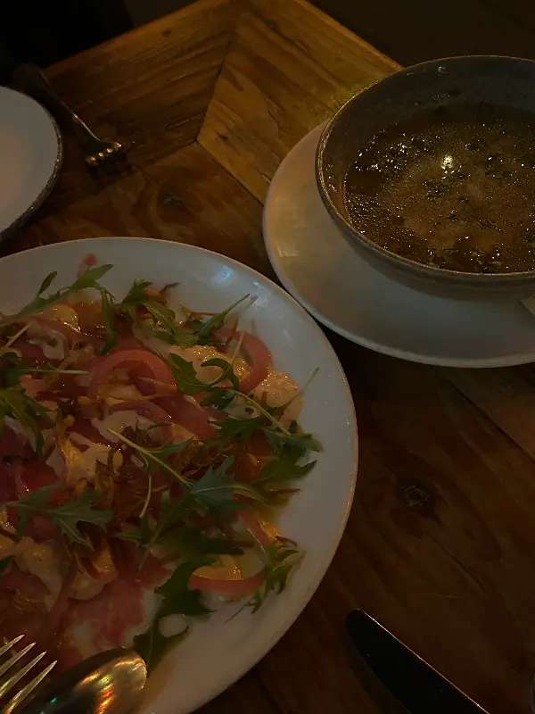 가장 먼저 눈에 띈 것은 화려한 비주얼의 샐러드였다. 신선한 루꼴라와 얇게 슬라이스 된 붉은색 채소가 조화롭게 어우러져 식욕을 자극했다. 드레싱은 과하지 않으면서도 재료 본연의 맛을 살려주는 듯했다. 입안 가득 퍼지는 신선함!